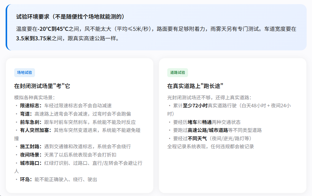 新国标其实准备了一系列的测试,涵盖了封闭考场和真实道路。